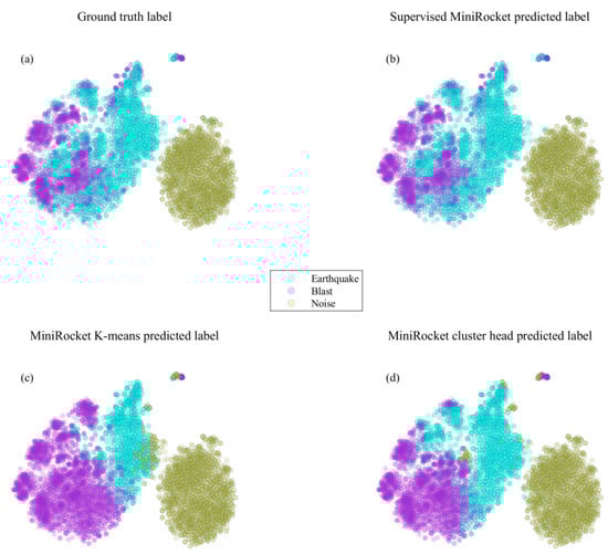 Since MiniRocket has the function of feature extraction, this allowed us to visualize the distance in the feature space of different types of seismic events. For this purpose, we used the t-sne method to reduce the dimension of data to two dimensions for visualization. In Figure 5, there are three types of data ground truth labels; visualization results of the feature interval of the supervised MiniRocket method; visualization results of the feature interval of the MiniRocket + K-means method; visualization results of the feature interval of the MiniRocket + cluster head method. The characteristic distance of noise events is far from that of blast and seismic events, while the characteristic distance of blast and seismic events is very close, so it is difficult to distinguish. Although the MiniRocket + cluster head method has some disadvantages in noise identification, it has greater advantages over the MiniRocket + K-means method in distinguishing difficult blast and seismic events.