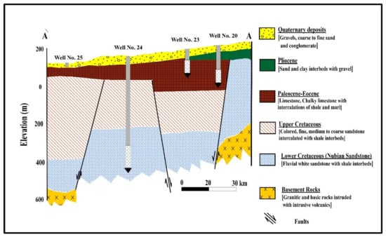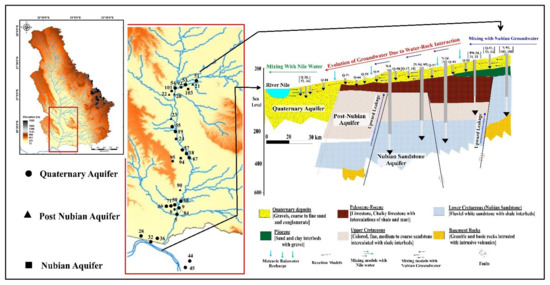In the past decade, Wadi Qena has experienced rapid development, primarily related to agricultural projects that resulted in increased demand for groundwater resources. These groundwaters are exploited from three main aquifers: the Nubian Sandstone aquifer (NSA), the Post-Nubian carbonate aquifer (PNA), and the alluvial Quaternary aquifer [5,6].