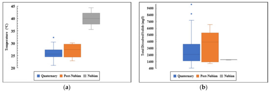 Box plot for the (a) temperature (°C) and (b) TDS (mg/L) of groundwater in the Wadi Qena basin.