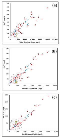 Major ions concentrations (mg/L) versus total dissolved solids (TDS) in mg/L relationships for groundwater wells tapping aquifers in the Qena basin (a) Ca2+ Versus TDS, (b) Mg2+ versus TDS, (c) Na++K+ versus TDS, (d) HCO3− versus TDS, (e) Cl− versus TDS, and (f) SO42− versus TDS.
