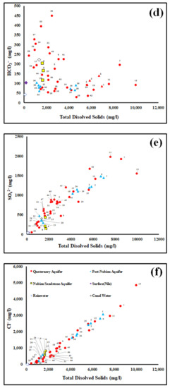 The chemical characteristics of the groundwater in the studied aquifers are presented in Table 1. According to the results of the chemical analyses, the pH of Quaternary aquifer groundwater ranged from 6.8 to 8.6 with a median of 7.3, the pH of PNA samples ranged from 6.7 to 8.1 with a median of 7.2, and the pH of NSA samples ranged from 7.6 to 8.2 with a median of 7.9. The pH values reflect that most groundwater samples had neutral to slightly alkaline characteristics. Groundwater temperature mainly depends on the geothermal gradient and ambient temperature at the land surface [43]. The groundwater temperature in the Quaternary aquifer ranged from 21 to 32.3 °C, the PNA samples’ temperatures ranged from 22.9 °C to 30.1 °C, and the NSA samples’ temperatures ranged from 35.6 °C to 44.4 °C (Figure 4a). The total dissolved solids (TDS) measurement is usually used as a general indicator of water quality [44]. Groundwater is classified as a fresh, brackish, and saline [45]. Results (Table 1) show that the Quaternary groundwater’s TDS measurements ranged from 426 to 9975 mg/L with a median value of 2472.6 mg/L, identifying it as a fresh to saline water type. The PNA samples’ TDS measurements ranged from 1134 to 6969 mg/L with a median of 4348.9 mg/L, identifying it as a fresh to saline water type. The NSA samples’ TDS measurements ranged from 1496 to 1737 mg/L with a median value of 1676 mg/L, identifying it as brackish water (Figure 4b). In the upper region of the analyzed area the Quaternary and PNA groundwater had lower TDS values (Figure 1) which may be attributed to the direct recharge from local precipitation. In addition, the Quaternary groundwater downward, close to the River Nile, had lower TDS values, indicating that the River Nile percolates into the aquifer. In general, most of the major ions (Na+, Mg2+, Ca2+, SO42−, and Cl−) were positively correlated with TDS (Figure 5a–f), indicating that their concentrations’ increase was controlled by flow path, geochemical processes, and water–rock interaction between the groundwater and aquifer matrix.