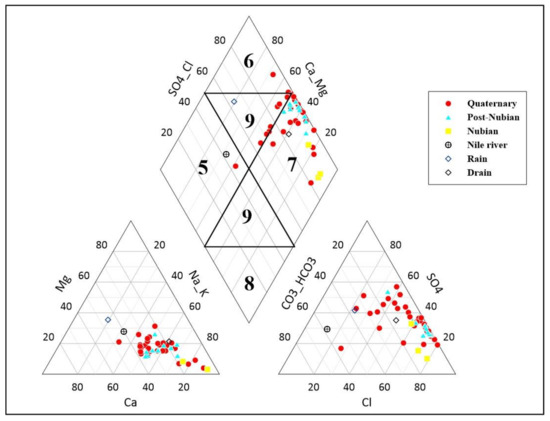 The major ion chemistry is shown by Piper’s tri-linear diagram (Figure 6; [46]), which provides information regarding hydrogeochemical facies and the evolution of groundwater based on the relative proportions of major ions [47]. In the lower left triangle of the Piper diagram, groundwater samples from different aquifers are plotted between the two end members of the NSA groundwater and the surface water (Nile water and canal water). In the lower right triangle, groundwater samples from the NSA and PNA are shown to have higher Cl contents. In the diamond diagram, most of the three aquifer groundwater samples are distributed in subareas 7 and 9. Approximately 52% of the Quaternary groundwater samples, 100% of the PNA and NSA groundwater samples, and all canal samples are plotted in subarea 7, reflecting that Na and Ca are dominant cations, and that Cl and SO4 are dominant anions. In subarea 7, PNA samples are plotted in the upper corner of the diamond; NSA samples are plotted in the right side corner, due to variations in groundwater chemistry as a result of leaching and dissolution of diverse minerals rich in chloride that are embedded and form different aquifer matrices. In contrast, 32.26% of Quaternary groundwater samples are in subarea (9), where no cation–anion pair exceeds 50%, reflecting the impact of the mixing process due to drainage water infiltration.