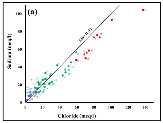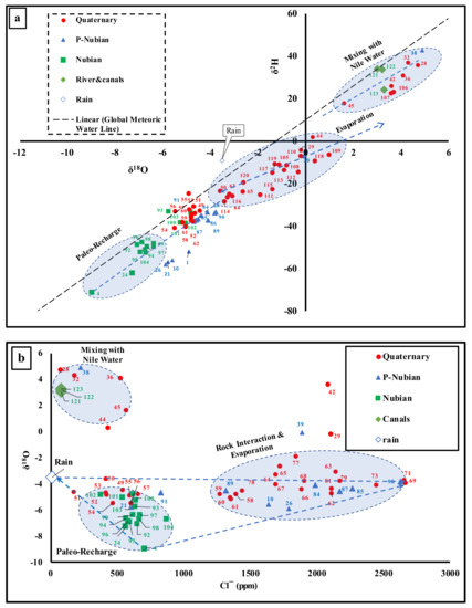 (a) δ18O (‰) versus δ2H (‰) and Cl− (mg/L) (b) δ18O (‰) versus Cl (mg/L) for groundwater samples tapping different aquifers in the Qena Basin, (GMWL, from [51]). Isotopic data serials greater than 48 are from [23,24,51]; the rainwater sample is from [53].