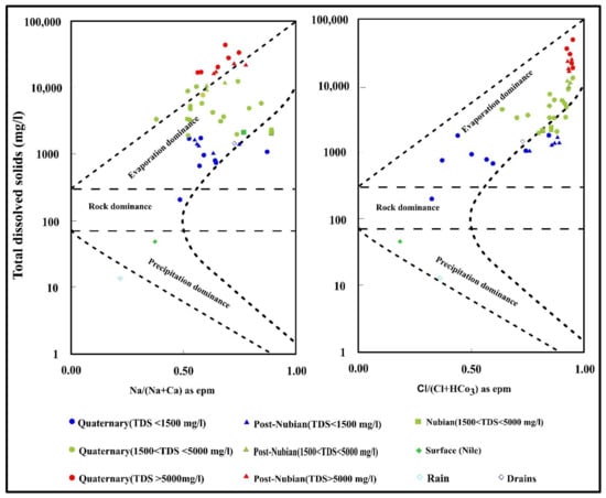 The results above show that most of the major ions (Na+, Mg2+, Ca2+, SO42−, and Cl−) directly correlated with TDS (Figure 5a–f), indicating that increases in their concentrations were consistent with the flow path from upstream (northeast) to downstream (southwest) (Figure 1). Both geochemical and physical processes (dissolution and evaporation) as well as water–rock interaction were controlling factors for salinity variations in the study area (Figure 8; [54]). Figure 8 represents the ratios of ((Na+ + K+)/Na+ + K+ + Ca+2) and major anions (Cl−/Cl− + HCO3−) separately, as a function of TDS. The plot indicates that groundwater samples of the studied aquifers were primarily distributed in the evaporation dominance field. This suggests that the groundwater chemistry in the area was primarily controlled by the evaporation process, as well as the water–rock interaction factor, because the annual rainfall and groundwater recharge were insignificant.