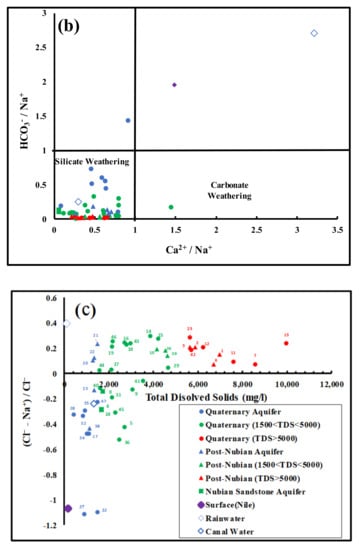 The influence of hydrochemical processes that affect water quality such as ion exchange, mixing, and leaching can be detected using chemical ion ratios [55,56,57]. In the current study, the relations between different ionic concentrations were used to understand the relationships between the ions and factors affecting groundwater chemistry (Figure 9). A higher concentration of sodium in the groundwater of the NSA and a lower concentration in the groundwater of the PNA indicate silicate weathering [58]. In contrast, the groundwater in the Quaternary aquifer and in most of the PNA samples showed a slightly lower concentration of Na+, which may be attributed to the Ca/Na exchange process (Figure 9a) due to the presence of clay interbeds in the aquifers. The relations of Ca+2/Na+ versus HCO3−/Na (Figure 9b) show that most of the groundwater samples of the three aquifers had more Na+ than Ca+2, Mg+2, and HCO3−, which could be explained by silicate weathering. The relation of (Cl− − Na+)/Cl− vs. TDS (Figure 9c) shows that 51.61% of Quaternary samples and 83.33% of Post-Nubian samples in the study area had a positive value; this indicates a direct cation exchange process between Na+ and K+ dissolved in groundwater with Ca2+ and Mg2+ embedded in the aquifer matrix. In contrast, the rest of the Quaternary samples, the Post-Nubian samples and all Nubian groundwater samples had negative values that indicate a reverse cation exchange process.