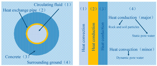 In order to solve the differential equation above, boundary conditions need to be determined. There are three types of boundary conditions: (1) Dirichlet boundary condition, i.e., the temperature on the boundary is known or is a function of time. It is suitable for the situation if the specific temperature on the periphery of the surrounding ground can be determined after running for a period of time. (2) Neumann boundary condition, i.e., the heat flux on the boundary is known or is a function of time. For the heat convection between the heat exchange liquid and the inner wall of the pipe, it can be simplified (as shown in Equation (4)). (3) Cauchy boundary conditions, i.e., the temperature and heat transfer coefficient of the fluid medium in contact with the boundary, are known, as shown in Equation (5).