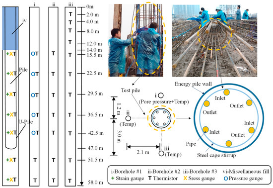In order to verify the reliability of the model, a full-scale in situ test of a large diameter over length energy pile (1000 mm-diameter, 44 m-long) was conducted in Nanjing, China. The heat exchange pipe is high-density polyethylene (HDPE) pipe connected in with 3U formalization, and the dimensions are 25 mm × 2.3 mm. Multiple sensors were fixed to different parts of the test pile to capture relevant parameters (Figure 3).