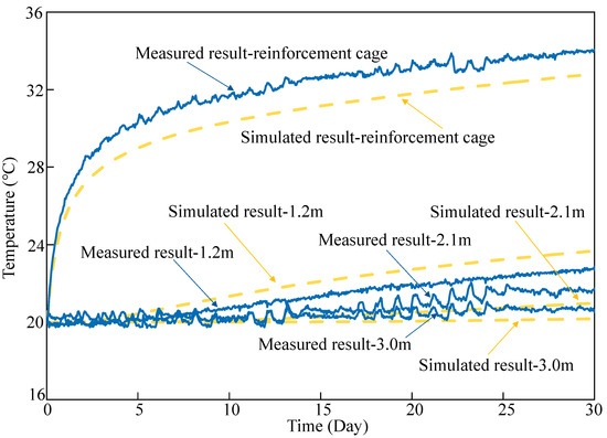 The finite element model of the test pile was established, and Figure 4 compares the simulated and measured results of four different feature locations of the reinforcement cage, 1.2 m, 2.1 m and 3.0 m from the center of the pile. Although the temperature values of different positions are slightly different, the simulated and measured results show very similar variation trends, which reflects the rationality of the model. The reasons for the deviation are: (1) the heat exchange pipe in the energy pile is loose and not completely fixed on the steel cage, which leads to the deviation of the position of the heat exchange pipe; (2) the soil layer is saturated, and the influence of heat convection in free water in soil pores is not considered. Therefore, the finite element model can reflect the spatial and temporal evolution characteristics of energy pile operation without considering the factors of groundwater heat convection.