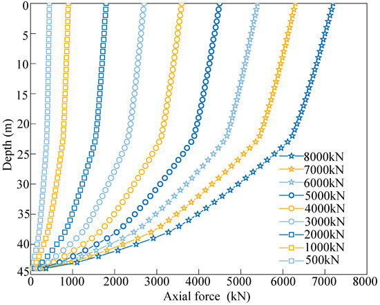 Figure 5 reports the relationship between the pile axial force calculated according to the model and the vertical load on the pile top. It can be found that the vertical load exerted by the pile top continuously spreads to each layer through the pile body, and the axial force of the pile body decreases along the depth. It is noted that the pile bottom load is almost zero; even if the load reaches 1.5 times the ultimate capacity (8000 kN), the pile tip still does not increase significantly. It coincides with the law of pile load transfer [27], which indicates that the numerical model is reliable.