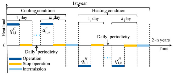 In a complete operation cycle, the intermittent operation is used to maintain the heat balance between the heat taken from underground and the heat dissipating, thus benefiting the long-term, efficient and stable operation of the system [28,29]. Furthermore, from the perspective of environmental friendliness and efficient utilization, the daily intermittent operation is a better choice [30,31]. Therefore, the daily thermal load is simplified, as shown in Figure 6.