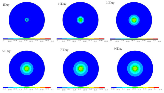 Based on the actual data from the in situ tests, the simulation condition is set as follows: the initial ground temperature field is 20 °C; the simplified model of thermal load is adopted; the average heat transfer power in summer and winter conditions are 171 W/m2 and −171 W/m2, respectively; the heat transfer coefficient of the inlet side (η) is 0.6; and the heat flux of the inlet and the outlet pipe are 205.2 W/m2 and 136.8 W/m2, respectively. Figure 7 shows temperature field evolution over time under summer conditions. It can be seen that heat gradually diffused outward through heat exchange liquid and heat exchange pipe, energy pile and surrounding ground. The temperature of the pile and surrounding ground gradually increased. Additionally, the thermal influence area gradually expands with time, but the thermal influence area does not expand infinitely, and the final thermal influence radius is about 4 m.