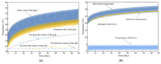 Figure 8a exhibits the temperature changes over time at different locations under intermittent working conditions in summer. The temperature at different locations changes periodically and increases. The inner wall temperature is greater than the external wall, and a lower temperature can be observed if the test point is far from the center of the pile. Moreover, the temperature in the ground more than 1 m away from the center of the pile can no longer reflect the characteristics of intermittent thermal load, and its temperature slowly rises. Figure 8b reports the average temperature of the pile under intermittent working conditions in summer. It can be seen from the results that the average temperature of the pile gradually increases with time, while the difference between the highest and lowest temperature of the pile is relatively stable, varying between 0 and 4.2 °C, and the maximum temperature difference of the pile occurs when the first cycle operation stops.