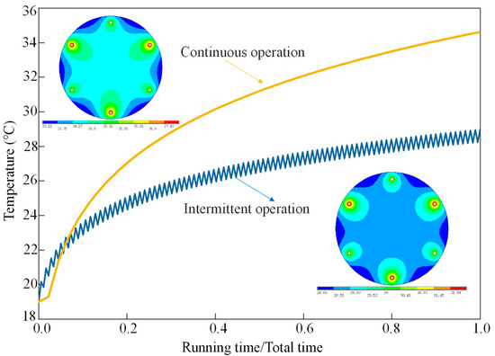 Figure 9 reveals the temperature distribution of the pile body after intermittent operation for 90 days (outage ratio = 0.5) and continuous operation for 45 days under the condition of the same total heat transfer. Intermittent operation-induced temperature change is less than that of continuous operation; specifically, the temperature is 5.6 °C lower after 90 days of intermittent operation than after 45 days of continuous operation. Furthermore, intermittent operation can reduce the maximum temperature and reduce the temperature inhomogeneity of the pile.