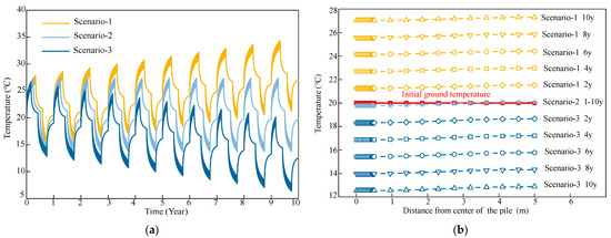 Figure 10a shows the temperature of the pile–soil contact surface under different scenarios. It can be found that the proportion of cooling and heating load in an annual cycle significantly affects the change in the temperature field. Specifically, under the condition of the cooling and heating load balance (scenario 2), the periodic change in ground temperature within a certain range of initial ground temperature does not affect the long-term operation of the heat transfer system. Under the condition of heating load dominance (scenario 1), the ground temperature cannot be restored to the original ground temperature within an annual cycle, leading to a continuous rise in temperature, and at this time, the temperature of the inlet and outlet of the heat exchange pipe is increased. Under the condition of cooling load dominance (scenario 3), the opposite is true. Figure 10b reports the ground temperature recovery at different years under the three scenarios. It can be found that the ground temperature can be completely recovered under the condition of balance, but it cannot be completely recovered under the condition of heating load (or cooling load) dominance, which leads to cold and hot accumulation after the long-term operation (10y). In practical engineering, the imbalance of heating and cooling load is widespread. If not intervened, it would not only reduce the heat transfer efficiency of the system but also seriously affect sustainable utilization [33]. Generally, when the heating load is dominant, auxiliary measures should be adopted, such as adding cooling towers; when the cooling load dominates, joint heating measures such as solar energy can be taken.