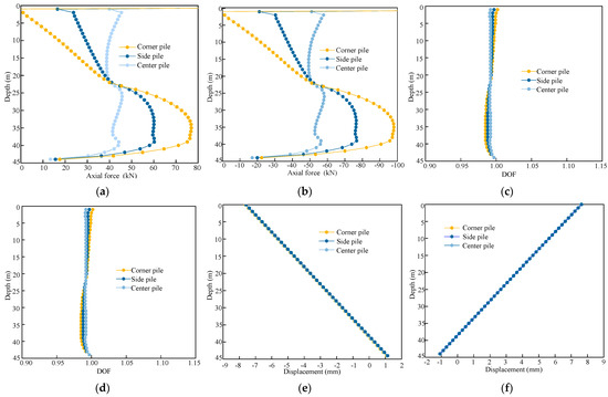 Figure 12a,b shows the temperature axial force of the pile body when all the nine piles are used as energy piles. In the summer condition, the temperature of the pile increases, and the axial compressive force generates; in the winter condition, the temperature of the pile decreases, and the axial tensile force occurs. The magnitude and distribution of the temperature axial force are related to the position of the energy pile. The center pile, side pile and corner pile show different characteristics. The temperature axial force generated by the center pile (pile 5) is evenly distributed along the pile. The temperature axial force of the corner pile (1/3/7/9) and side pile (2/4/6/8) is small at both ends and large in the middle, and the maximum value is 35 m below the pile top. Under the same temperature load condition, a smaller degree of freedom (DOF) can generate a greater temperature force, and the DOF is related to the constraints of the pile tip and surrounding ground. The DOF of the pile group under winter and summer conditions are shown in Figure 12c,d. It can be found that the variation in pile temperature does not significantly change the size and distribution of DOF. Specifically, the upper part of the corner pile (pile 1/3/7/9) has the largest DOF, followed by the side pile, and the center pile has the smallest DOF, indicating that different positions of piles under the platform have different DOF. The DOF of each pile varies in the range of 0.985~1, suggesting that when the pile group consists of an energy pile, the constraint between piles is very small, thus inducing smaller additional stress. Moreover, the pile group is heated or cooled at the same time, and the geological conditions around the pile are relatively consistent, resulting in relatively consistent displacement, as shown in Figure 12e,f.