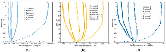 Figure 14c indicates the axial temperature stress distribution of the side pile under different layout scenarios. The compressive stress is generated in scenarios 1 and 4, especially in scenario 4, where the compressive stress at the top of the pile reached 454 kPa, accounting for 6.8% of the total stress. In the scenario of a non-energy pile, the temperature tensile stress is generated. In scenarios 2 and 3, the tensile stress on the pile top reaches 235 kPa and 238 kPa, respectively, which reduces the compressive stress on the pile top by 3.7%, and the pile body has no tensile stress.
