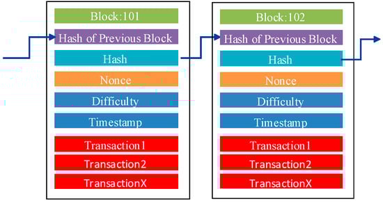 Blockchain technology is a relatively new research area. It is first proposed in 2009 by Satoshi Nakamoto and used for financial safety and digitization of currencies [13]. Blockchains are designed for decentralized storage secured by a cryptographic signature and distributed maintenance. Figure 1 shows an example of a blockchain structure in Bitcoin, which is one of the most famous digital currencies. The hash in one block is calculated according to the content of this block through a cryptographic hash function (Bitcoin uses SHA-256). The hash can determine the input data’s integrity, because any changes in the original data will result in extensive changes to the hash [14,15]. Using the cryptographic hashes here will ensure that any changes to the block will cause mismatching of the hash and content. The hash in this block will be the header of the next block. A sequence of blocks linked by hash numbers is called a blockchain. One advantage of this mechanism is that if anyone attempts to tamper with the transaction information in a past block, all the subsequent blocks also need to be tampered with [16]. The information stored in the ledger is validated and maintained by every participator in the network, and thus no centralized authority is needed. It should be noted that multiple (but not necessarily all) nodes owe a full copy of the entire database.