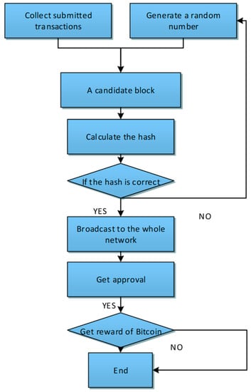 Bitcoin uses a proof-of-work consensus mechanism, where the ability to verify and publish a transaction is dependent on the computing power of a node [17]. Once a block is published, some reward will be given as encouragement. In order to publish a block and receive the reward, a node must complete the following steps, shown in Figure 2: