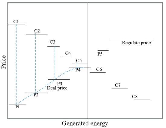 At each step, various new orders are inserted, or old orders are withdrawn from the pool. As soon as the time comes, the first buy order and the first sell order from the lists are inspected to verify if they match. If they match, a transaction occurs. The order with the smallest residual amount is fully executed, whereas the order with the largest amount is only partially executed and remains at the head of the list, with its residual amount reduced by the amount of the matching order. Clearly, if both orders have the same residual amount, they are both fully executed. The price clearing process is shown in Figure 4. In this figure, C1–C8 is the bidding price for each consumer, and P1–P5 is the bidding price for each producer.