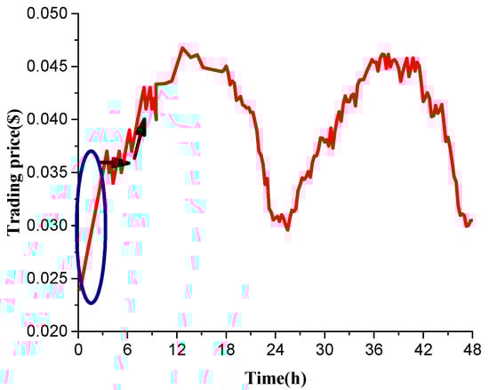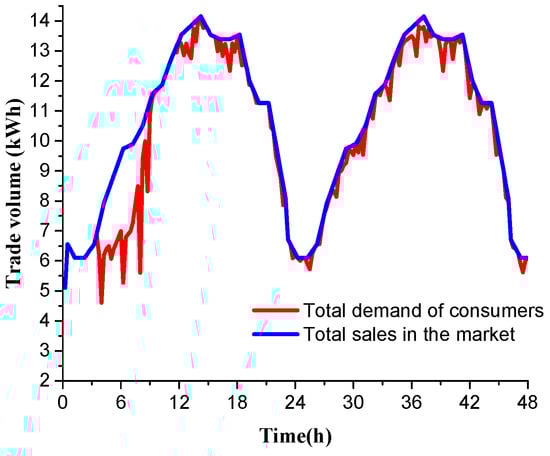 Figure 8 shows the total trading curve of a 2-day bidding process. As the figure demonstrates, the order price of the generators was much lower than that of the consumers in the first 4 hours, so the total trading quantity was equal to the demand. However, after a certain period in the market, the generators began to use the price strategy in order to obtain more profit. Thus, the generators’ bidding capacity and the market’s total trading quantity started to decrease. With the demand increase, more energy was required, and in order to make more profit, the generators started to increase the quantity, and the consumers started to increase the bidding price. At about 9:00 a.m., the market’s equilibrium status was achieved, and the average total trading quantity followed the demand. After this point, the market was in a dynamic equilibrium stage.