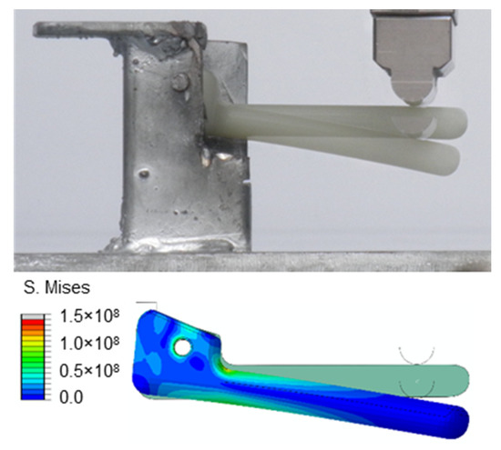 In order to validate the finite element analysis, the flexural test was carried out by applying a deformation, and the maximum force values at the previously determined deflections (2, 4, 6 and 8 mm) were compared. The results of the experimental and the simulated investigation with the unloaded and the loaded (8 mm deflection) door handle are presented in Figure 8. The simulation results were shown on a solid body model with the distribution of stress presented on the deformed body with a colour ramp, while the undeformed figure was a solid green colour. It can be seen from the compilation that the correspondence was notable; however, quantitative values were compared for an exact comparison.