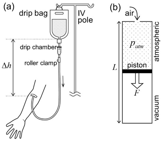 Gravity versus atmospheric pressure as a driving force for drip infusion. (a) An IV drip bag hung from an IV pole at a constant height, , from a drip point on the arm maintains a constant infusion pressure to overcome the venous pressure. (b) Vacuum piston cylinder. A piston, with a cross-sectional area, , separating a sealed vacuum chamber and an open chamber under atmospheric pressure, , moves towards the closed end of the cylinder. The larger the diameter, , of the piston (cross-sectional area ), the larger the magnitude of the driving force, , on the piston. The length of the cylinder, , determines the moving stroke of the piston.