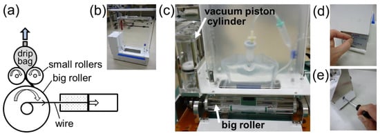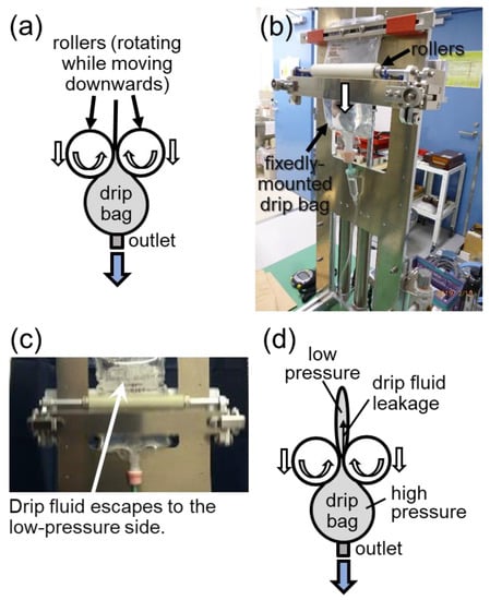 Another prototype (hereafter, MOVE-ROLLER) that worked by squeezing the drip bag using a pair of rollers, was also developed (see Figure 4). The rollers rotated themselves and squeezed a fixed-mounted drip bag while being pulled down by the vacuum piston cylinders (see Figure 4a,b). However, a problem arose in which the drip fluid escaped from the high-pressure side to the low-pressure side inside the drip bag, resulting in leakage through the small gap between the rollers (see Figure 4c,d).