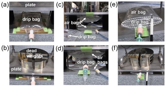 (a,b): Test No. 1. A drip bag is placed between parallel plates with no air bag in (a), and then loaded with dead weight in (b). (c,d): Test No. 2. Two pillow-shaped air bags are placed between the parallel plates in (c), then a drip bag is inserted in between the two air bags, and the sandwiched drip bag is loaded with dead weight in (d). (e,f): Test No. 3. A drip bag is enwrapped in a sleeping-bag-shaped air bag in (e), and then loaded with dead weight in (f).