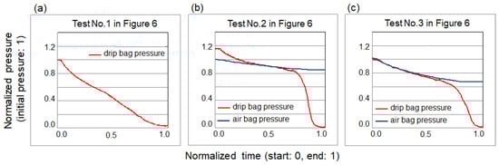 Test No. 1 showed the steady decreasing of the drip bag pressure that was normalized by the initial drip bag pressure, though under a constant force from the dead weight (see Figure 7a). This may have been due to the change of contact surface area between the plate and the drip bag as the drip bag deflated. The pressure value in the ordinate in Figure 7b,c was normalized by the initial air bag pressure. At the starting point in Test No. 2, the drip bag pressure was higher than the air bag pressure (see Figure 7b). This may be attributed to the surface tension occurring at both the curving (arc-like) side-surfaces of the drip bag which were not in contact with the air bags []. However, this did not happen in Test No. 3, in which the side-surfaces of the enwrapped drip bag were in contact with the sleeping-bag-shaped air bag (see Figure 7c). In both Tests No. 2 and No. 3, it can be observed that the air bag pressure decreased slightly due to the change of contact surface area with the plates as the air bags compressed the drip bag. Seeing that the pressures of both drip bag and air bag showed the best unison in Test No. 3 (see Figure 7c), we concluded that the sleeping-bag-shaped air bag (see Figure 6e) was the best inflating mechanism to pressurize the drip bag.