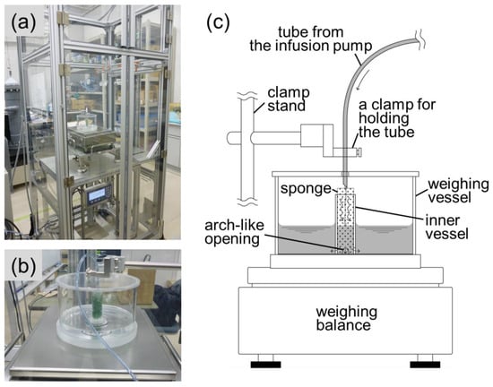 As shown in Figure 9a, a gravimetric (weighing) test bench was enclosed by a wind shield to avoid any wind effect. A pneumatically liftable stage supported a weighing balance at a variable height for flow rate measurement at different head pressures. Figure 9b shows a specially designed weighing vessel sitting on a weighing plate. The weighing range of the weighing balance was up to 6 kg, with a resolution of 0.01 g. As shown in Figure 9c, the weighing vessel had a special feature, in which an inner vessel stood on the bottom surface of the weighing vessel. One method of avoiding liquid dropping from the tube into the weighing vessel could be to immerse the tube into the liquid, but this would create immersion effects, such as a buoyancy effect, of the immersed tube beneath the rising liquid level. To maintain a constant immersed depth of the tube, many studies have adopted an overflowing inner vessel where a tube or a needle is immersed into the overflowing inner vessel [,,,]. Another method could be to maintain a constant liquid bridge or stream connecting the tube outlet and a liquid-absorbing material, such as glass filter or foam mounted inside a weighing vessel []. For liquid collection in this study, we combined the two methods, by not overflowing the inner vessel but filling it with liquid-absorbing spongy material so that the liquid stream from the tube outlet was absorbed. Liquid then wove through the sponge, down the inner vessel, and flowed out from the openings at the bottom of the inner vessel (see Figure 9c).