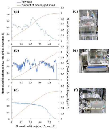 Of note, the flow rates were adjusted by using the roller clamp and by monitoring the liquid drops in the drip chamber of the infusion tube set (see Figure 1a), which made it difficult to accurately adjust the flow rate. This resulted in certain discrepancies in flow rates between measurement runs. It may appear incomprehensible to observe that a quickly decreasing flow rate from the AIR-BAG (blue curve in Figure 11) produced a higher amount of discharged liquid (orange curve in Figure 11) than the highly consistent flow rate by the gravity method. This occurred because the actual (non-normalized) flow rate of AIR-BAG was slightly higher than that of the gravity method, resulting in a faster accumulation of discharged liquid in the weighing vessel.