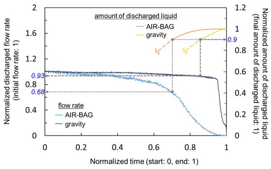 In the previous section, we observed that the AIR-BAG prototype showed the most promising performance in terms of flow rate stability. To see how AIR-BAG compared with the existing gravity-driven method (pole-suspended drip system), we plotted the flow measurement results obtained for both methods in Figure 11. The left and right ordinates correspond to the discharge flow rate and the amount of discharged liquid, respectively, whereas the abscissa shows the measurement time. All quantities were represented in normalized and non-dimensional values to ease comparison. To avoid curves’ overlapping that may cause confusion, only part of the curves (in orange and yellow) for the amounts of discharged liquid are shown in Figure 11.