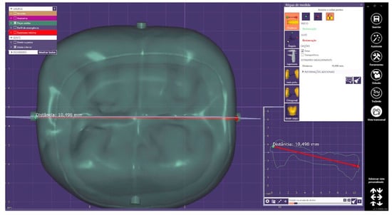 The resulting STL file was imported and virtually measured using a 3D analysis software (DentalCAD 2.4 Matera, Exocad GmbH, Darmstadt, Germany). Digital small marks with 1 mm in diameter were added to specific places on the buccal and palatal plates of the maxillary ridge (simulating buccal–lingual width measurements of edentulous area commonly performed during dental implant planning) to ensure reproducibility of the linear measurements of the buccal–lingual width of the alveolar ridge, performed for trueness analysis, following a previously described methodology []. Figure 1 shows in a smaller STL file of a dental crown how the digital markers were created using the CAD software of this study and how the digital linear measurements were performed. Briefly, the middle point of the upper limit of the mesh area of each digital mark was considered the point at which to start and finish each linear measurement, as this point was also planned to support the tip of the digital caliper on all 3D-printed dental casts. Furthermore, cross-section views of the mesh area containing the measurement were also created by the CAD software and used to orientate all digital linear measurements. Digital linear measurements were used as control values to be compared with the measurements performed directly on the 3D-printed dental casts.