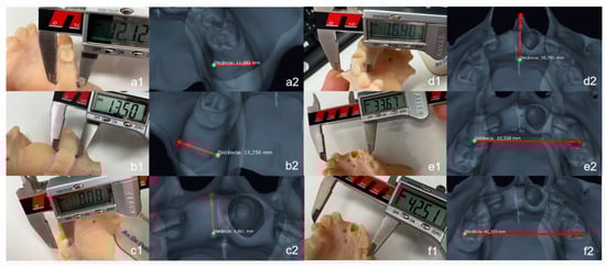Example of digital and analog measures taken in the 3D analysis software. (a). Left posterior buccal–lingual width with markers; (b). Right posterior buccal–lingual width with markers; (c). anterior buccal–lingual width with markers; (d). Distance between anterior nasal spine and infraorbital foramen; (e). Distance between tip of cusps of teeth 13 and 23; (f). Distance between tips of cusps of teeth 14 and 24. Test measurements with digital caliper (1) and control digital measurements on the CAD software in occlusal view (2).