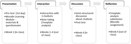 In this one-month project, a learning module entitled ‘The integration of AI and chatbots in language learning’ was specifically designed on Moodle for both groups. This module included a short introduction to the topic and several materials (three videos and an article about chatbots in language learning) that all participants had to watch and read during the first week of the project, and they also had to complete a questionnaire based on the materials. The module contained a template analysis (TA) including links to the three chatbots and detailed instructions about the human–chatbot interaction, which is described in the following section (instruments). The participants were instructed to interact with the three conversational agents as future educators and not as English language learners. Therefore, they should carefully follow the instructions provided in the TA (use different registers, sentence structures, intentional mistakes, irony, etc.). This out-of-class interaction should take place over the four-week period on a regular basis. To ensure this regularity, the participants needed to take notes during their interaction together with 10 screenshots with the corresponding date as part of the template analysis (TA), which they needed to submit during the final week. The research comprised four stages as shown in Figure 1.