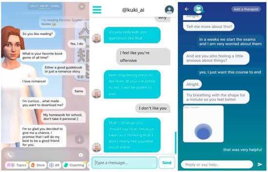 Screenshots of the interaction with the three conversational agents (from left to right: Replika, Kuki, Wysa).