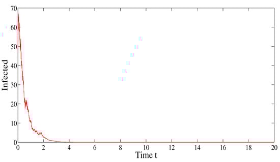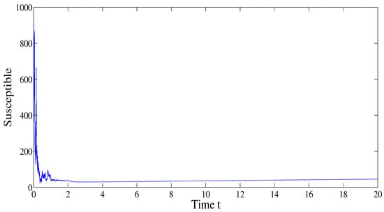 Figure 2 and Figure 3 show the dynamics of the susceptible population for the case of the extinction of the infection. From these figures, we observe clearly that the infected compartment converges to 0. It should be noted that, in this case, the susceptible class increases to attain their maximum, which means the the disease dies out. This is consistent with our theoretical results for the extinction of the infection.