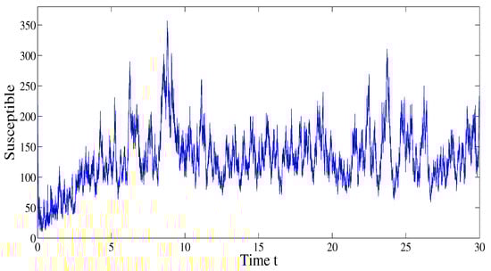 Finally, we have constructed a modified Milsteins Higher Order Method, which is implemented in order to validate our theoretical findings in relation to the model considered, with the aim to provide additional information to help the decision makers choose a good disease control strategy. On the one hand, we have decreased or increased the intensity of fluctuations. On the other hand, we have considered the effect of the Lévy noise in the development of the system variables. In possible sequels to our investigation in this paper, one can extend the model (1) to various fractional-order models, which are based upon several operators of fractional derivatives such as those known as the Riemann–Liouville, Liouville–Caputo and other fractional derivatives (see, for example, [,]) and also extend our model to an impulsive model such as that considered in [].
