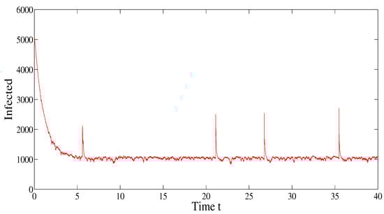 The behavior of the infection for both the infected and susceptible population with the Lévy jump process is graphically illustrated in Figure 4 and Figure 5 in the case of the persistence of the infection. In this epidemic scenario, we note from all of the four SICR compartments, that is, the infected, the susceptible, the chronic sub-population and the recovered, that the infection persists. This shows that our theoretical and numerical results are compatible.