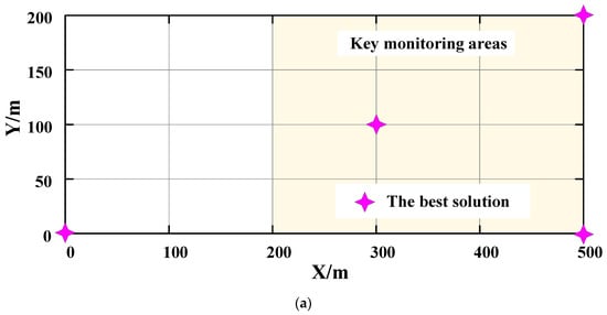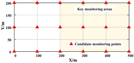 To verify the superiority of IPSO in solving the optimal arrangement of the microseismic monitoring network, a hypothetical artificial network was studied. For the mining working face, we assume that the X direction interval of the monitoring model is [0 m, 100 m], the Y direction interval is [0 m, 50 m], and the elevation is 200 m. The key monitoring area range is [200 m, 500 m] in the X direction, [0 m, 200 m] in the Y direction, and the elevation is 200 m. The grid spacing is 100 m × 50 m, and the sensor arrangement elevation is 0 m. The probability of shaking at all grid nodes is 1.0. The distribution of candidate points for all 18 stations is shown in Figure 2. The key monitoring area is the yellow area in Figure 2. According to the provisions of Table 1, FQ of the key monitoring area is 1.5, and the FQ of other monitoring areas is 1.0.