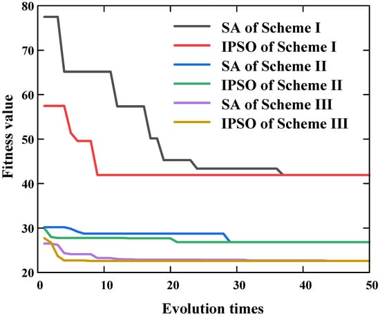 To simplify the solution process, it is assumed that all vibrations in the monitoring area can be monitored, and the expected value of the P-wave velocity is 3200 m/s. The test is divided into three schemes. Scheme I selects four candidate points from the set of the optimal network layout scheme. Scheme II selects six candidate points from the set. Scheme III selects eight candidate points from the candidate point set. The three schemes are solved by using IPSO, the simulated annealing algorithm (SA), and the exhaustive algorithm (EA), respectively. IPSO parameters are set as follows: the learning factor c1 = c2 = 2, the group size Npop = 100, w0 = 1, C = 10, dattr = wattr = 0.05, hrep = wrep = 0.05, the end condition ε0 = 0.001, and the search times Et = 50. The parameters of SA are set as follows: the initial temperature t0 = 97, the end temperature tf = 89.9, and the temperature drop ratio λ = 0.99.