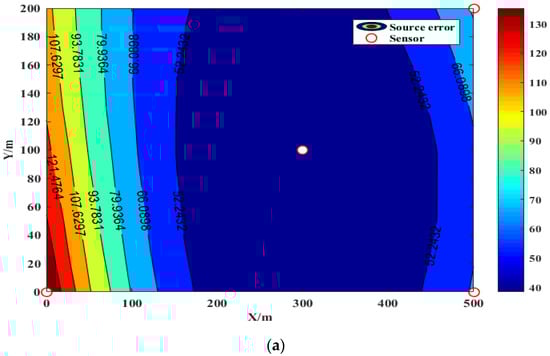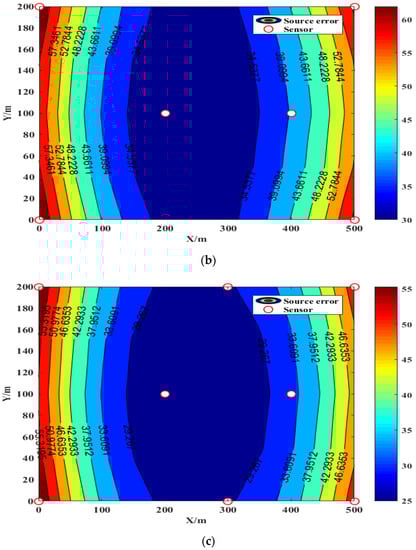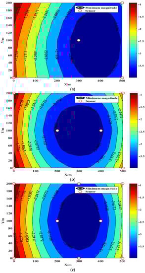 The source error and sensitivity of different sensor arrangement schemes are calculated by Equation (10). The evaluation results are shown in Figure 6 and Figure 7. It can be seen from Figure 6 that the source error of the six-channel sensor in scheme II is significantly lower than that of the four-channel sensor in scheme I, and the source error of the eight-channel sensor in scheme III is even lower than the previous two, keeping the source error in key areas within 50 m. It can be seen that as the number of sensors increases, the positioning error decreases significantly. The monitorable magnitude of the key monitoring area of Scheme II is −3.5481 in Figure 7, which is better than that of Scheme I, which is −3.1222. However, the sensitivity of scheme III and scheme II is the same. In addition, it can be obtained by calculation that the effective range factor FV of scheme I is 0.44, the effective range factor FV of scheme II is 0.75, and the effective range factor FV of scheme III is 0.87. It can be seen that the arrangement scheme of the eight-channel sensor of scheme III has the best monitoring advantage.