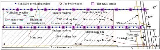 The mine was in the mining stage. The mining position is shown in Figure 9. There is a syncline at a distance of 300 m from the incision. The working face about 50 m before and after the syncline is used as the microseismic risk area, and the probability of mine earthquakes increases by 20%. The mining face within the mining stop line is taken as the key monitoring area, and the microseismic importance factor FQ of the key monitoring area is 1.5. According to the general principles of microseismic sensor arrangement, on-site mining technology, and geological conditions, 82 candidate points are selected in the installation area with a grid interval of 50 m according to the size of the layout area, since the installation positions are mainly arranged in the haulage roadway and the air return roadway. Using 20 sensors, the improved particle swarm algorithm (IPSO) proposed in this paper is used to optimize the design of the network optimization.