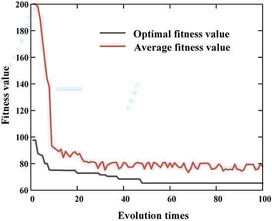 Due to a large number of candidate points, if the exhaustive method is used, there are a total of 3.5352 × 1018 solutions, which is not feasible in terms of time. However, using IPSO to solve the problem, it is found that the algorithm has a fast convergence speed (see Figure 10), and the running time is 244.86 s, the individual population has converged to the optimal solution when it has evolved to the 50th generations. The algorithm parameters are set as in Section 5.1. According to the field test, the expected velocity of the P wave is taken as 4200 m/s. According to the above setting parameters and models, the optimal layout scheme is shown in Figure 9.