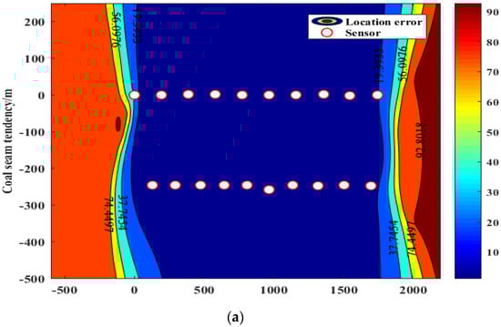 Evaluation of sensor arrangement on the coal seam roof (970 m). (a) Positioning errors. (b) Sensitivity.