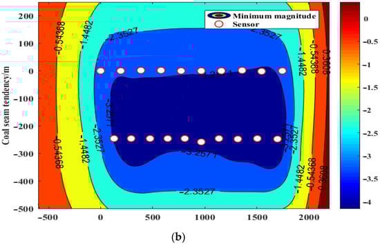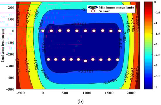 It can be seen from Figure 11 and Figure 12 that, regardless of the mine roof or floor, the minimum magnitude that can be measured in the ore body and its surrounding rock of the key monitoring area is −3.26, and the local position of the floor can reach −3.31. In the area around the working face, the minimum measurable magnitude of the top plate is −2.35, and that of the bottom plate is −2.48. Therefore, the sensor arrangement scheme has sufficient system sensitivity.