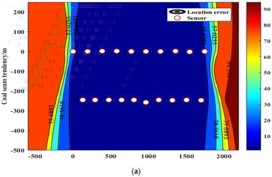 Evaluation of sensor arrangement on the coal seam floor (920 m). (a) Positioning errors. (b) Sensitivity.