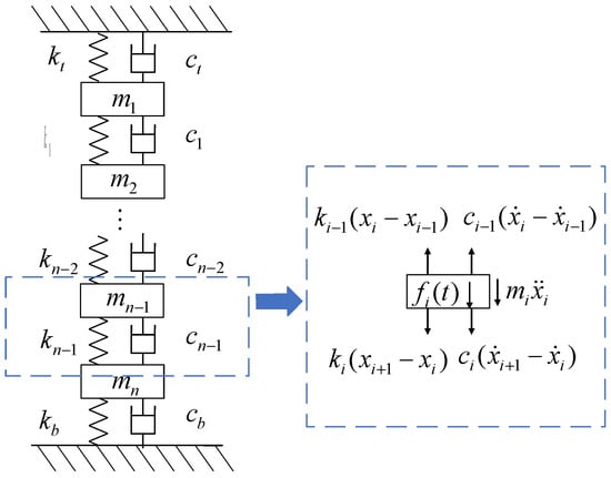 As is shown in Figure 1, the mass block m in the figure corresponds to the mass of a single-layer disk, and spring stiffness ki and damping ci correspond to the equivalent stiffness and damping of an insulating paper and insulating cushion block between two layers of the disk. According to the equivalent model and stress analysis of each disk, the dynamic equations of each disk can be written as follows: