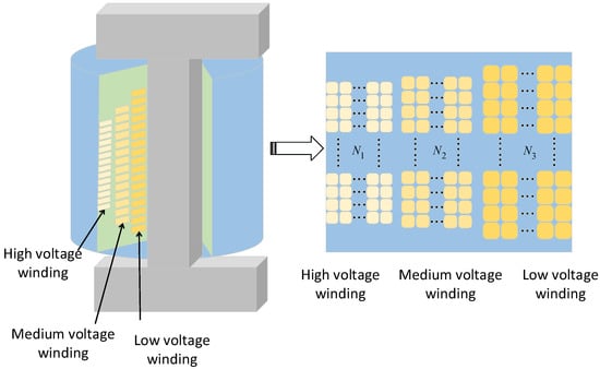 The axial section model of a three-phase transformer is shown in Figure 2. Generally, the disk-like structure is adopted in large and super large transformers with a high voltage of 110 kV and above, that is, the windings are in the radial direction, and the wire turns are continuously wound into a disk shape, and several disks are stacked into windings. The model parameter settings are completely based on the actual parameters of the real transformer.