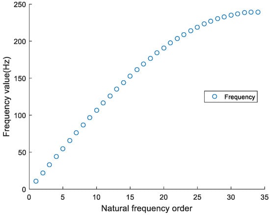 Figure 3 shows the natural frequencies of each order of high-voltage winding, which are arranged in ascending order. As shown, the frequency values, which are equal to , change linearly and change with the change of the square root of the ratio of stiffness to mass.
